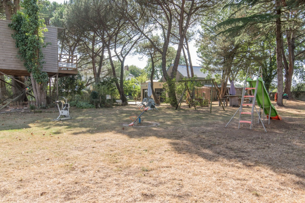 Sur l'espace "jeux" on retrouve balançoires, échelles de corde, trébuchet, toboggan double vague et la fameuse cabane "POMDEPIN" remplie de livres et de jouets. C'est là que les enfants se donnent rendez-vous.
